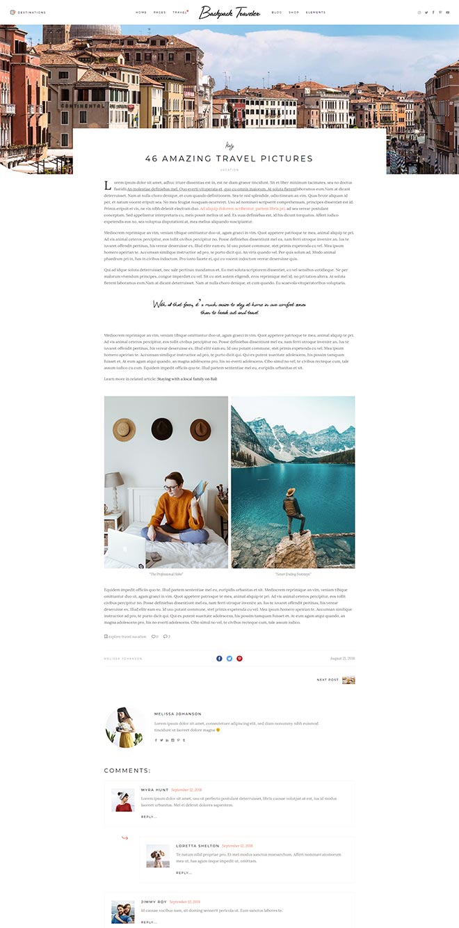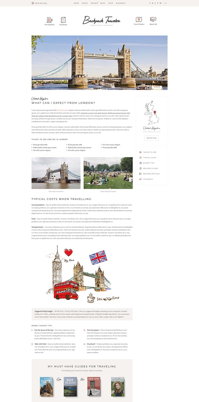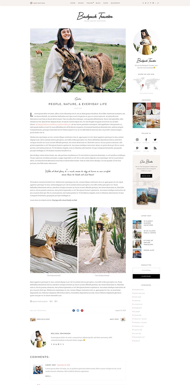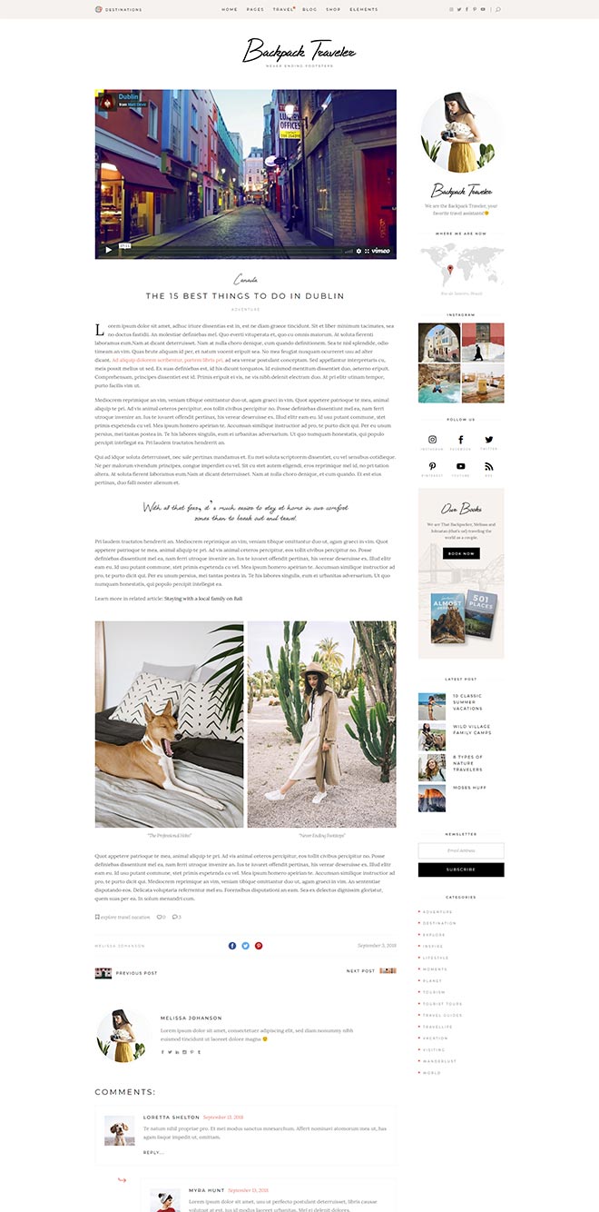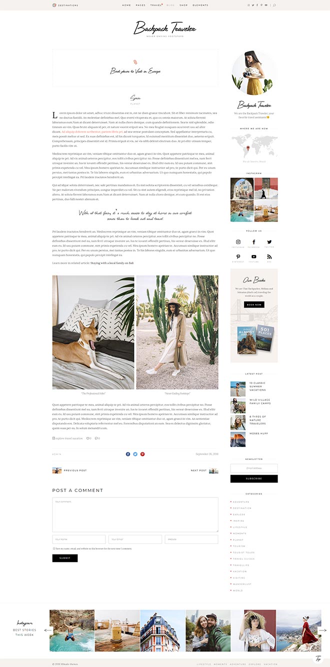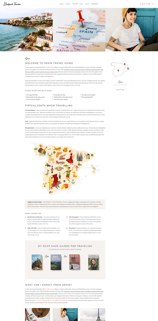 Practical Inner Pages Backpack Traveler comes with a stunning array of ready-to-use inner page, templates which are just amazing forletting everyone know about what you do & presenting yourself. You also get a destination map for highlighting all the places you visited or wrote about, as well as a contact form layout. d j c c